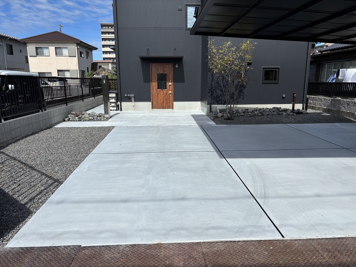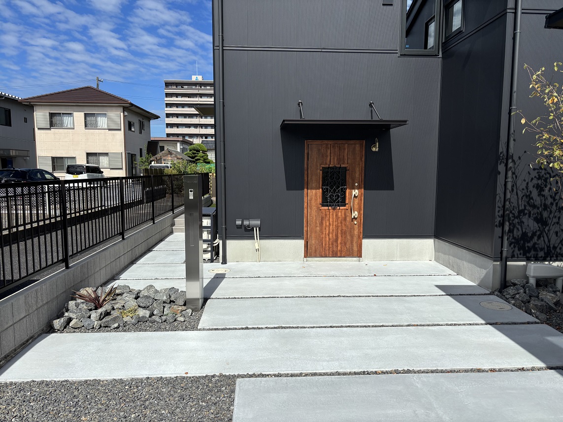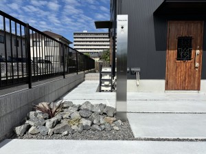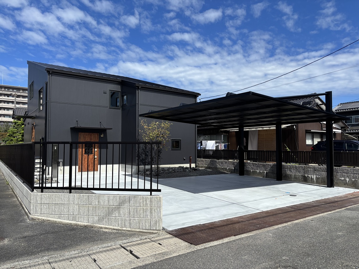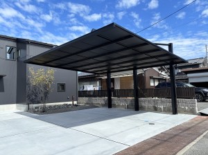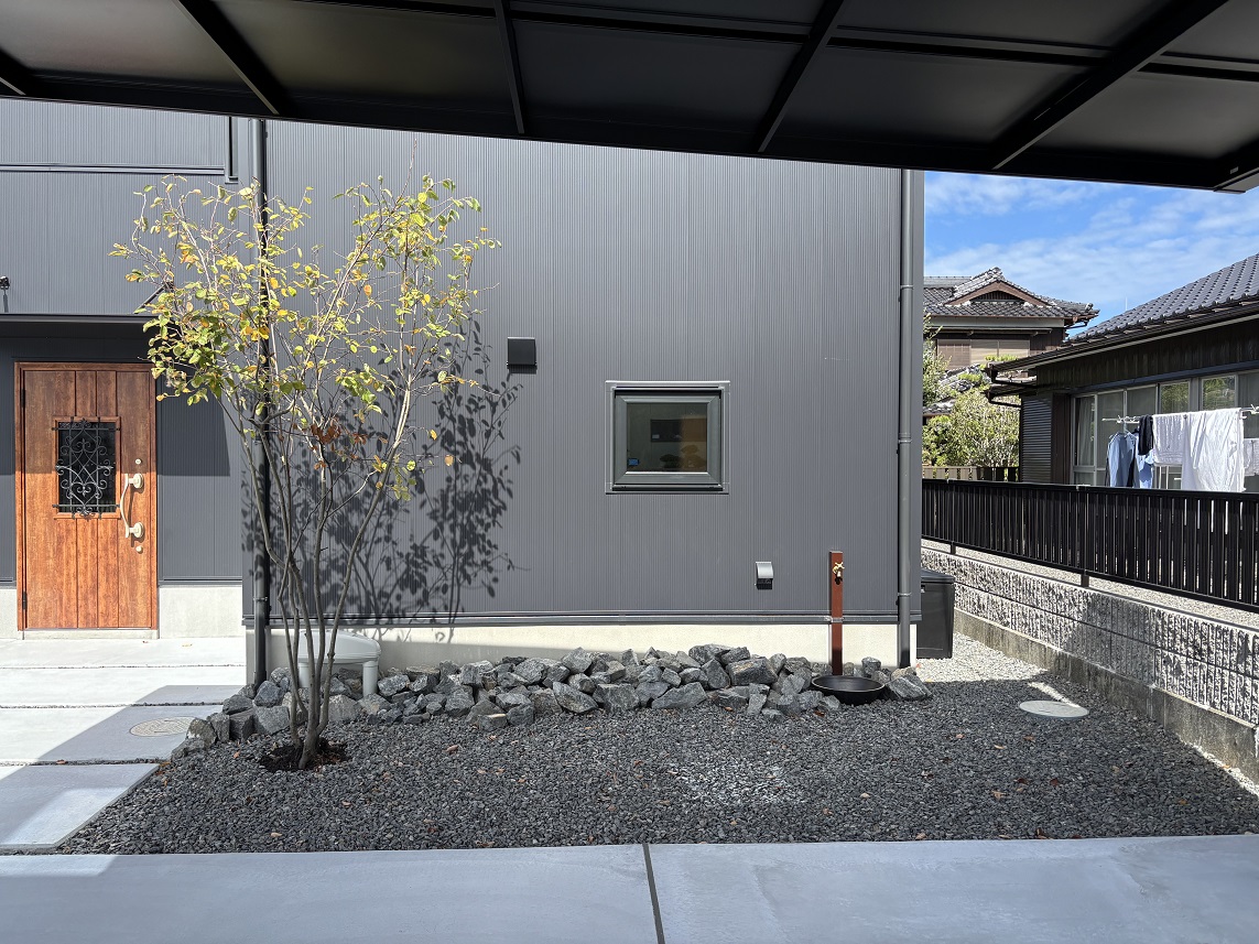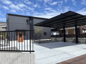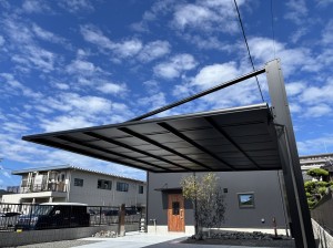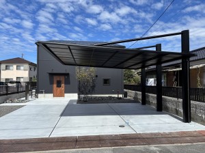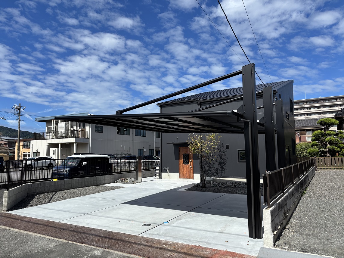 山口県下松市瑞穂町・M様邸 カーポートには三協立山アルミ『ダブルフェース』ブラックポリカーボネート仕様を取り付けています、 表札・ポスト・インターホンが一体となった機能門柱にシンボルツリーとしてジューンベリーを植え込みしています。