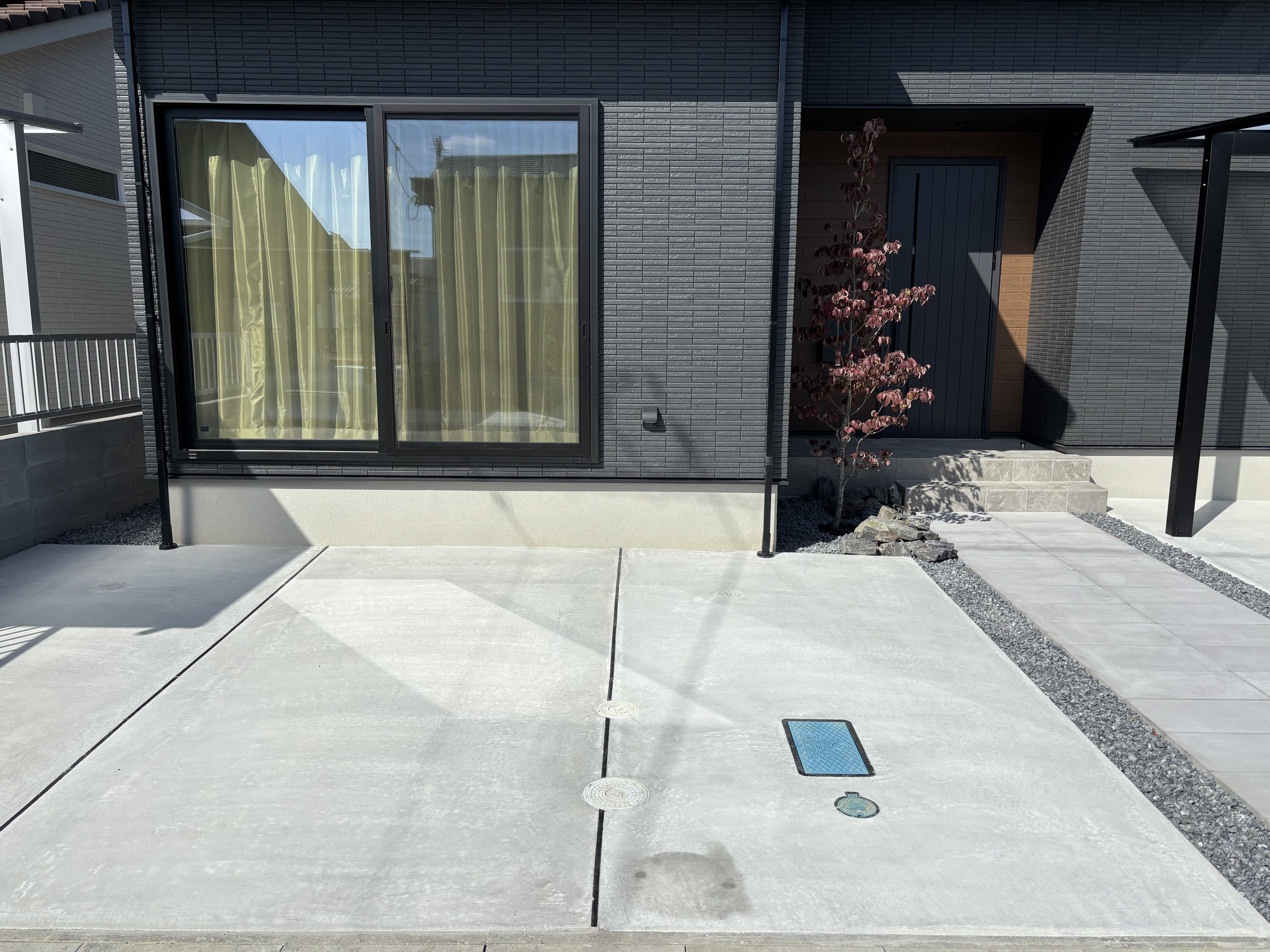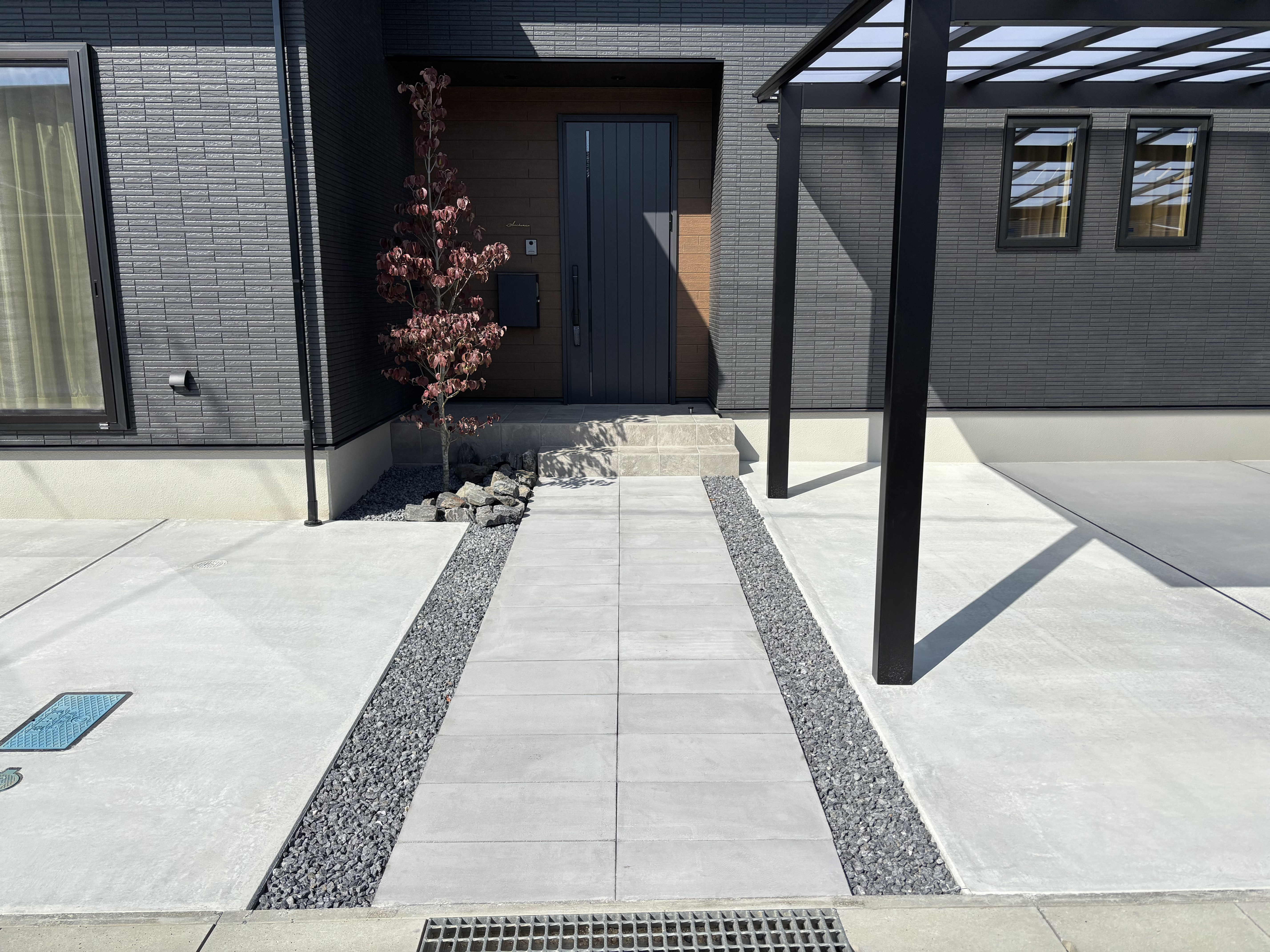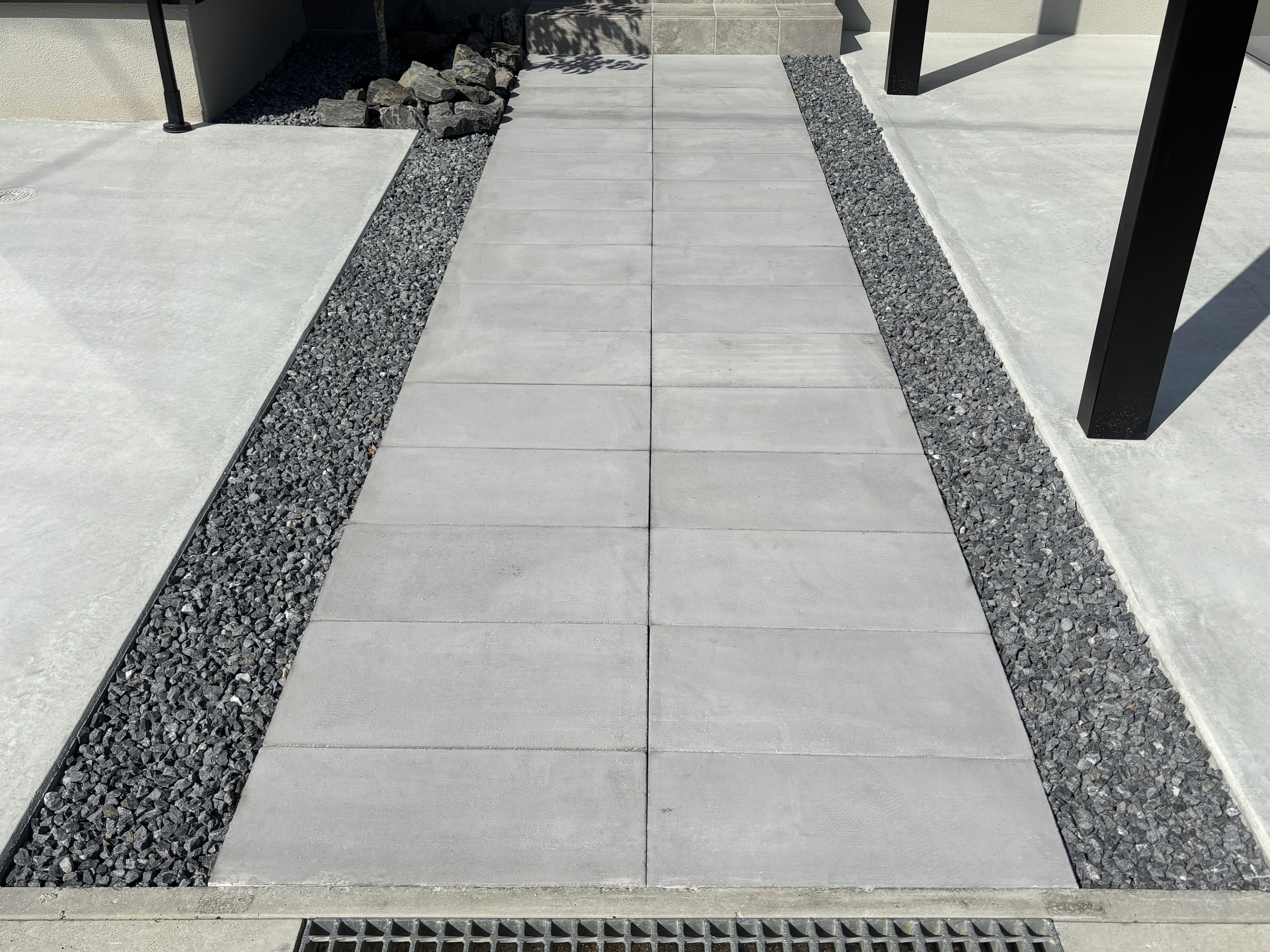 玄関までのアプローチには600×300サイズの平板を敷き、