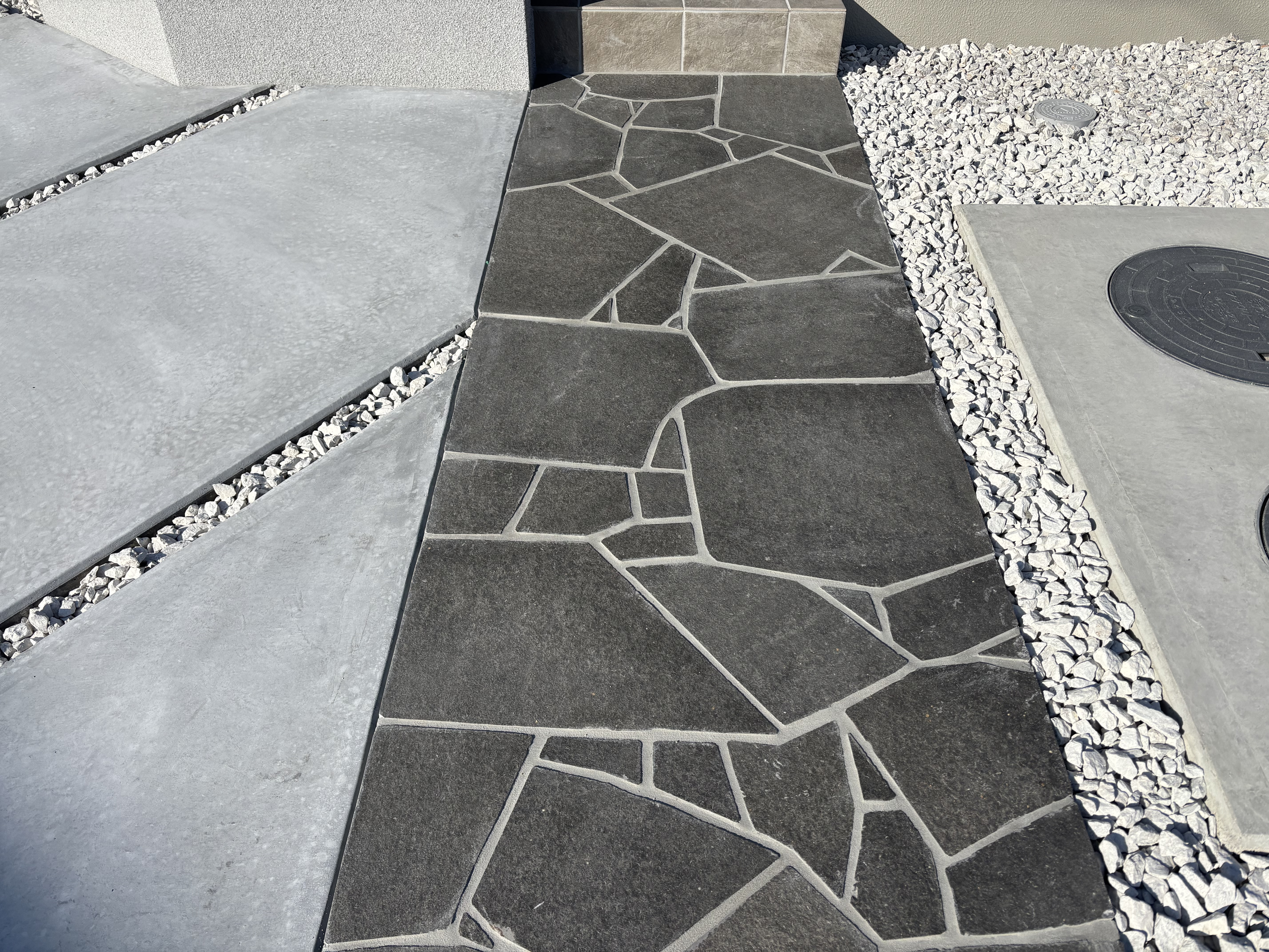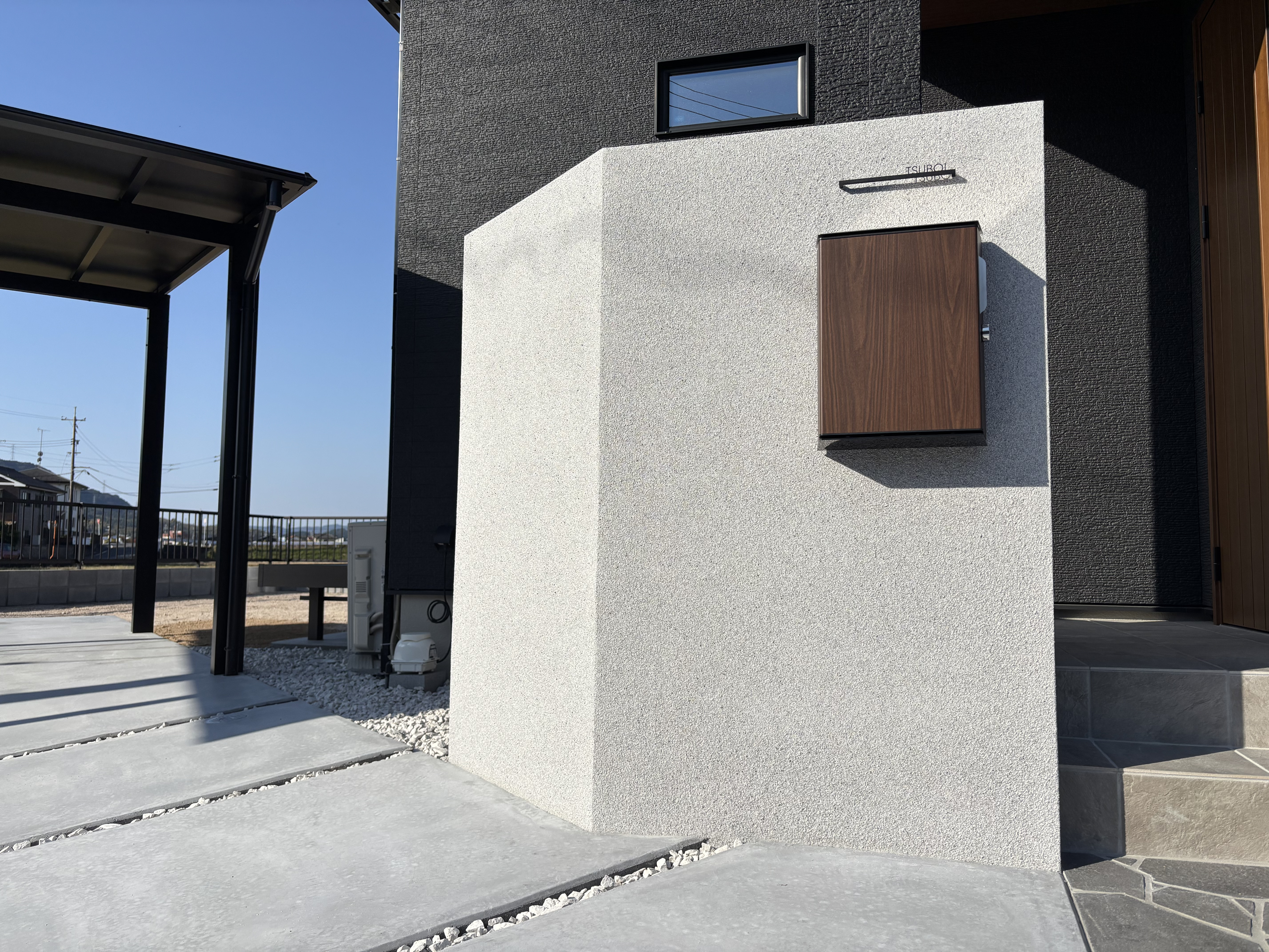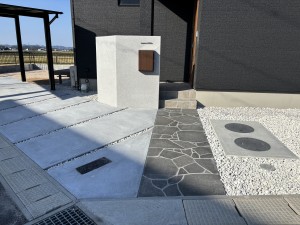 を使用しています、玄関までのアプローチには乱形石を敷、塗り仕上げの